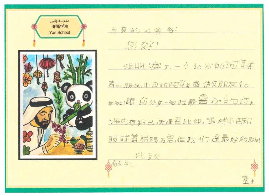 10岁的塞夫就读于阿联酋规模最大的公立学校亚斯学校。他在信中与习爷爷分享自己最喜欢的一句中国古诗——“海内存知己,天涯若比邻”,因为“虽然中国和阿联酋相隔万里,但我们是最好的朋友!”