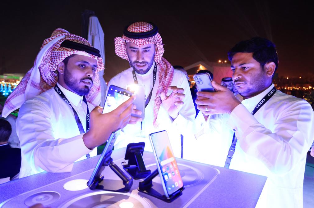 2022年3月13日,沙特阿拉伯首都利雅得,人们在中国品牌OPPO手机新品发布会现场体验新产品。
