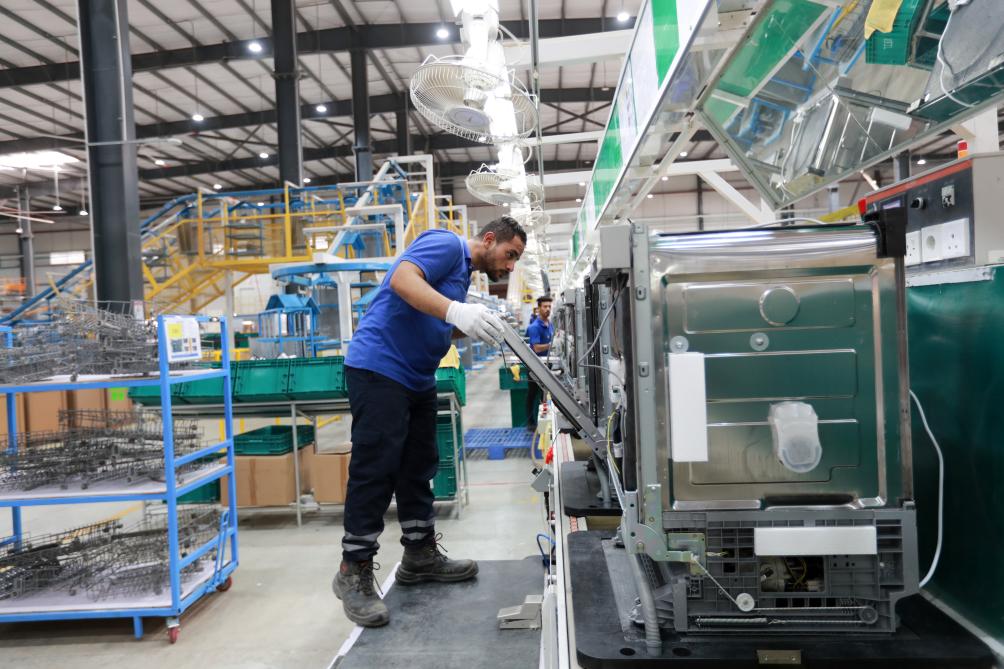 2023年8月10日,埃及苏伊士省中埃·泰达苏伊士经贸合作区,当地员工在中企洗碗机生产线上工作。