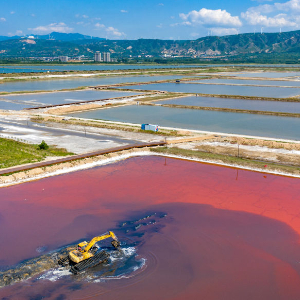 2024年5月10日,工作人员驾驶挖掘机在运城盐湖进行生态修复施工(无人机照片)。