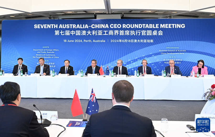 新华社澳大利亚珀斯6月18日电(记者梁君茜 王琪)当地时间6月18日上午,国务院总理李强在珀斯同澳大利亚总理阿尔巴尼斯共同出席第七届中澳工商界首席执行官圆桌会并致辞。约30位中澳商会和企业负责人出席。