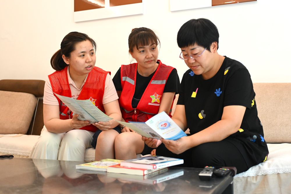 6月20日,宁夏银川市金凤区长城花园社区志愿者在入户为居民提供服务。
