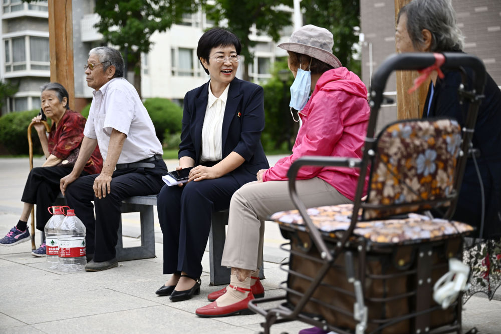 6月20日,宁夏银川市金凤区长城花园社区党委书记赵耐香(左三)在社区广场与居民交流。