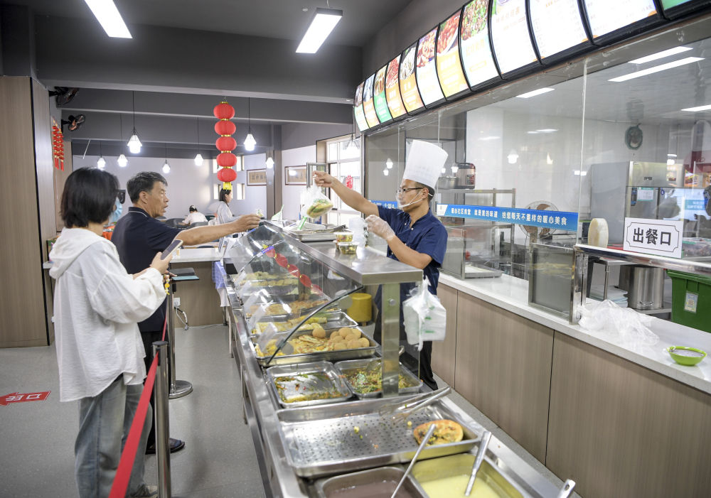 6月20日,宁夏银川市金凤区长城花园社区居民在社区食堂买早餐。