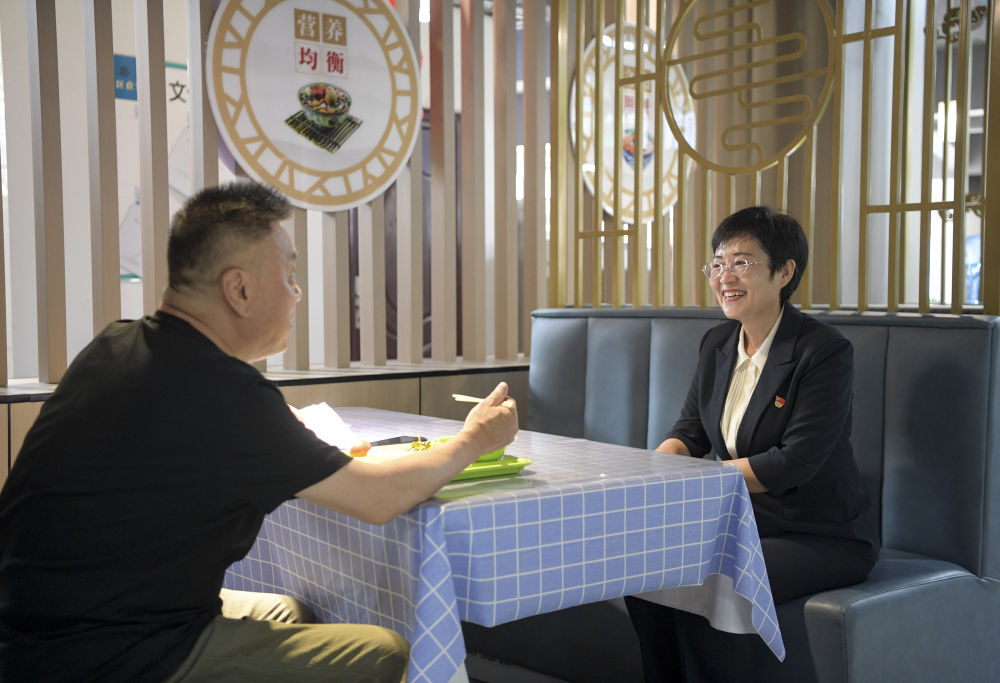 6月20日,宁夏银川市金凤区长城花园社区党委书记赵耐香在社区日间照料中心了解食堂运行情况。