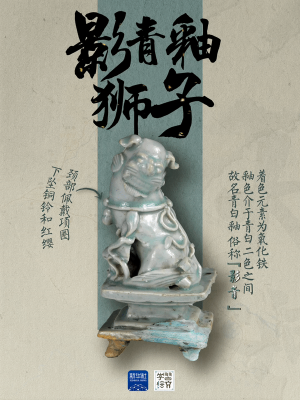 这件影青釉狮子高15.5厘米,宽8厘米,狮颈部佩戴项圈,下坠铜铃和红缨,身后有从项圈垂下的绶带,装饰简洁不繁缛。