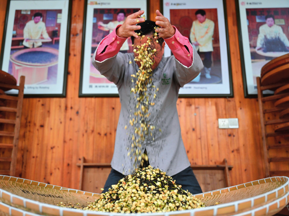 在福州茉莉花茶制茶工坊,福州茉莉花茶传统窨制工艺大师傅天甫进行制茶的第六道工序“窨”(2022年12月16日摄) 周义摄 / 本刊