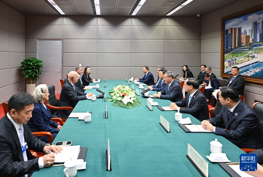 6月25日,国务院总理李强在大连会见世界经济论坛主席施瓦布。新华社记者 李响 摄
