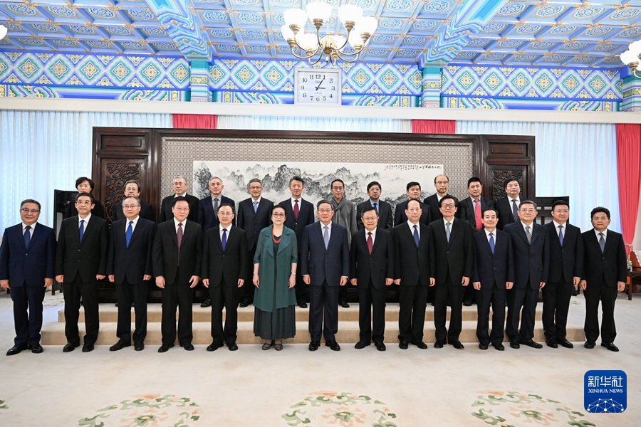6月26日,中共中央政治局常委、国务院总理李强向新聘任的国务院参事刘实、常继乐、李卓彬、尹中立、卢琦、张平、刘卫东和中央文史研究馆馆员孙晓云、张平、赵汀阳、荣新江、万建中颁发聘书。这是颁发聘书后,李强同大家合影留念。新华社记者 饶爱民 摄