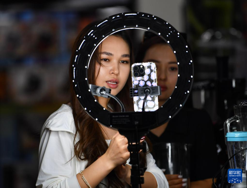 在中哈霍尔果斯国际边境合作中心一处电商基地,22岁的哈萨克斯坦姑娘艾格丽姆(左)在进行网络直播(6月10日摄)。新华社记者 赵戈 摄
