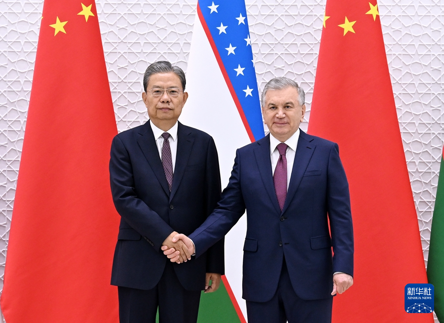 7月6日至9日,应乌兹别克斯坦最高会议参议院主席纳尔巴耶娃和立法院议长伊斯莫伊洛夫邀请,中国全国人大常委会委员长赵乐际对乌兹别克斯坦进行正式友好访问。这是7月8日下午,赵乐际在塔什干会见乌兹别克斯坦总统米尔济约耶夫。