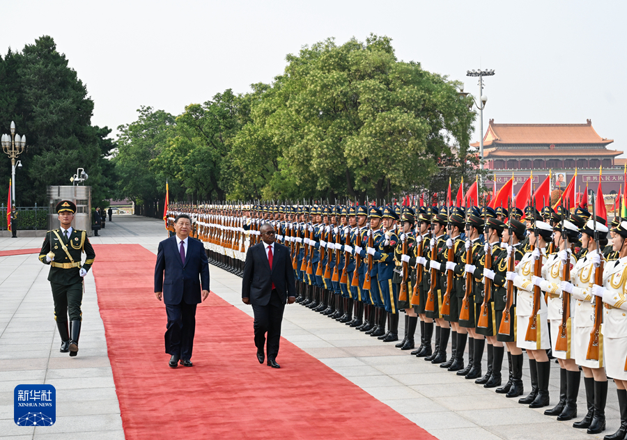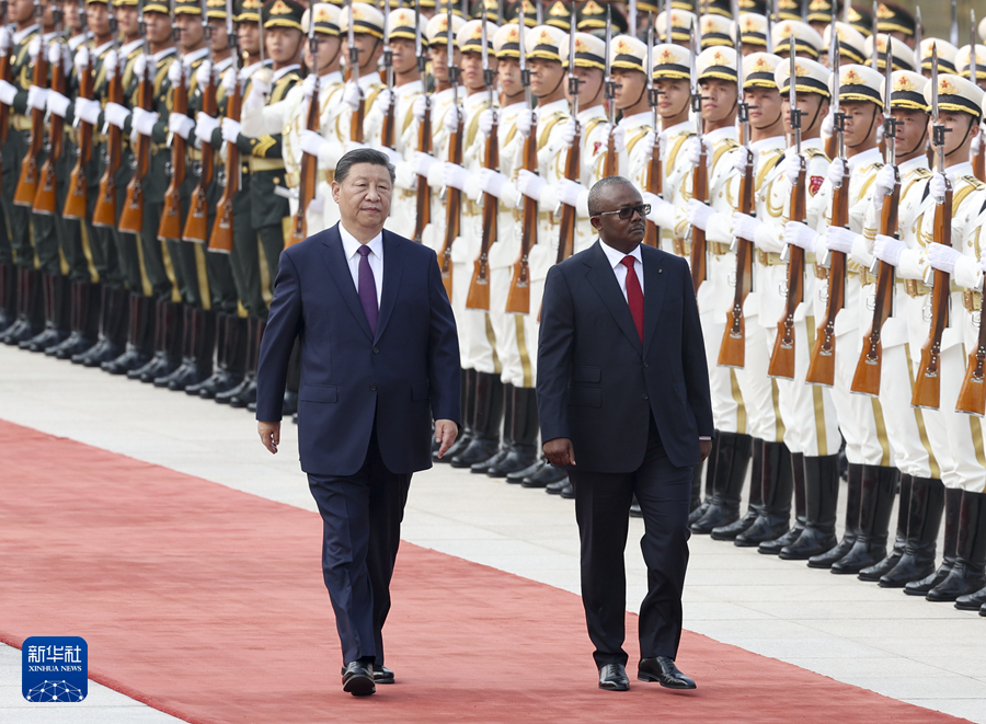 7月10日下午,国家主席习近平在北京人民大会堂同来华进行国事访问的几内亚比绍总统恩巴洛举行会谈。这是会谈前,习近平在人民大会堂东门外广场为恩巴洛举行欢迎仪式。