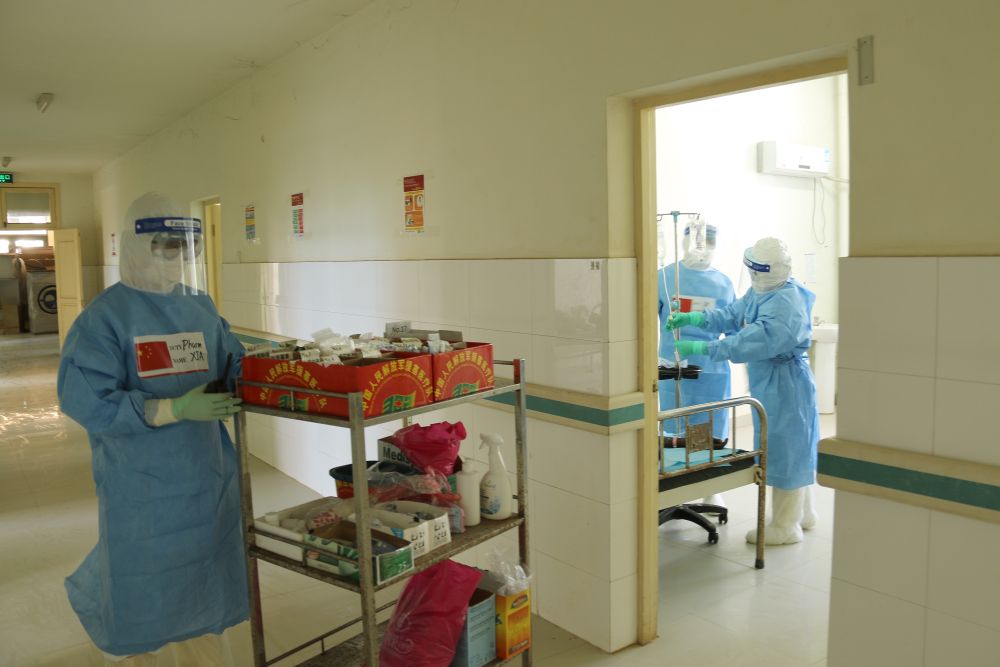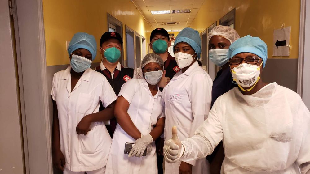 2020年5月26日,在刚果(布)首都布拉柴维尔,中国抗疫医疗专家组与当地一线医务人员交流,指导新冠肺炎病房建设。