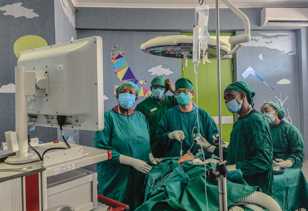2022年10月26日,中国援坦桑尼亚医疗队小儿外科医生丁国建(中)在坦桑尼亚达累斯萨拉姆的穆欣比利国立医院实施小儿腹腔镜手术(手机照片)。