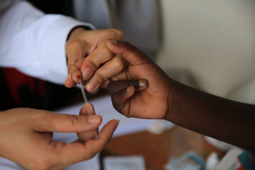 2018年12月8日,在马拉维南部布兰太尔市卡迪迪村卫生院,第六批中国援马拉维医疗队医生在义诊活动中为当地居民检测疟疾。