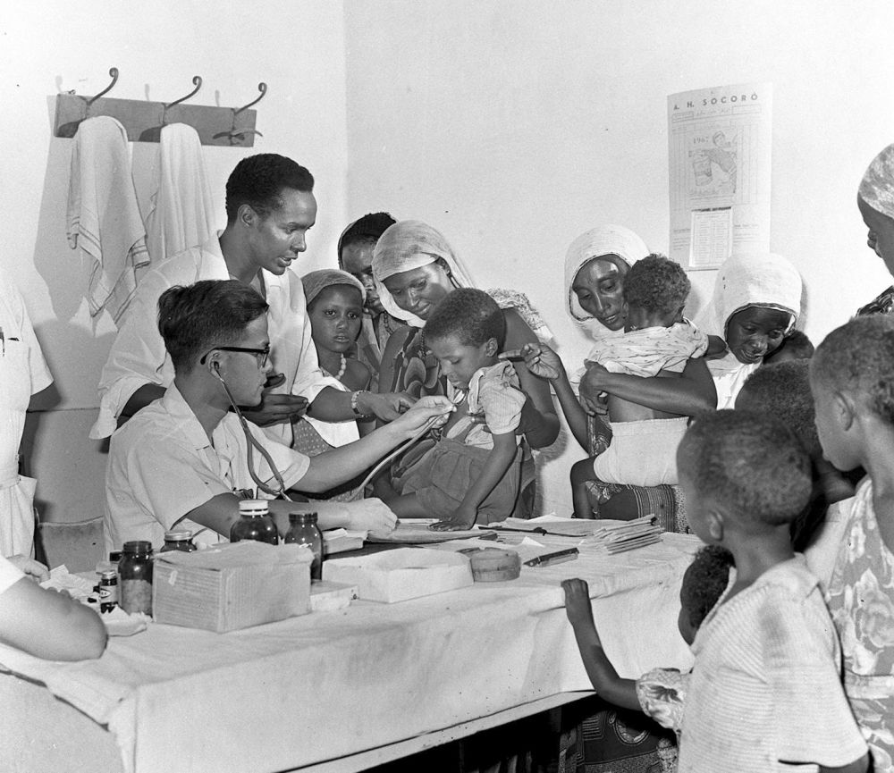 1968年4月,中国医疗队医生在索马里阿弗戈依镇巡回医疗时为当地儿童治病。