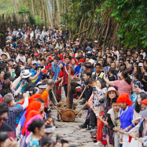 5月3日,各地游客在沧源县翁丁村和村民一起参加佤族传统民俗拉木鼓活动。(沧源县融媒体中心供图)