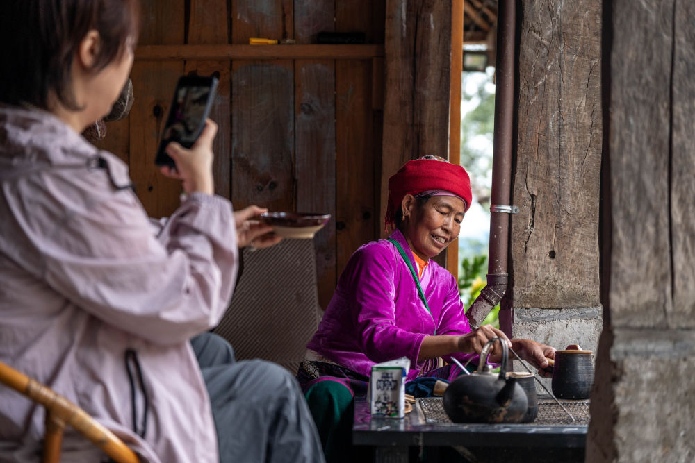 2024年9月13日,游客在云南省普洱市澜沧拉祜族自治县景迈山翁基古寨拍摄布朗族老人制作罐烤奶茶。新华社记者 胡超 摄