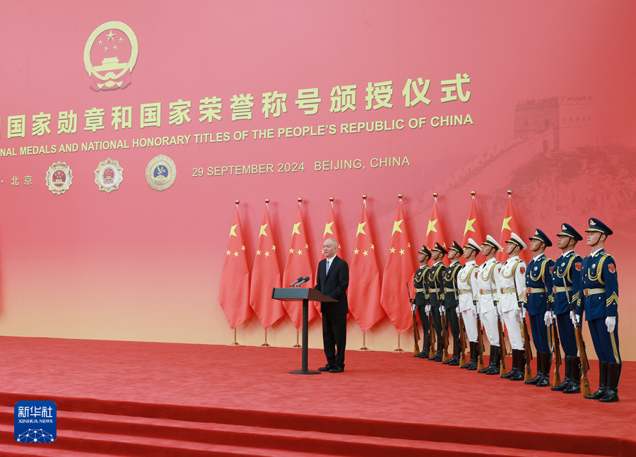 9月29日,中华人民共和国国家勋章和国家荣誉称号颁授仪式在北京人民大会堂金色大厅隆重举行。中共中央政治局常委蔡奇主持颁授仪式。