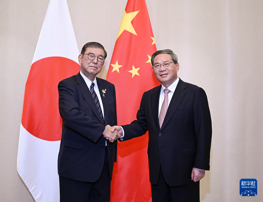 当地时间10月10日,国务院总理李强在万象出席东亚合作领导人系列会议期间会见日本首相石破茂。新华社记者 张领 摄