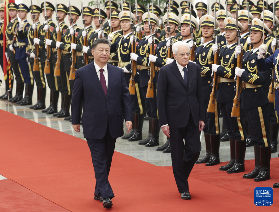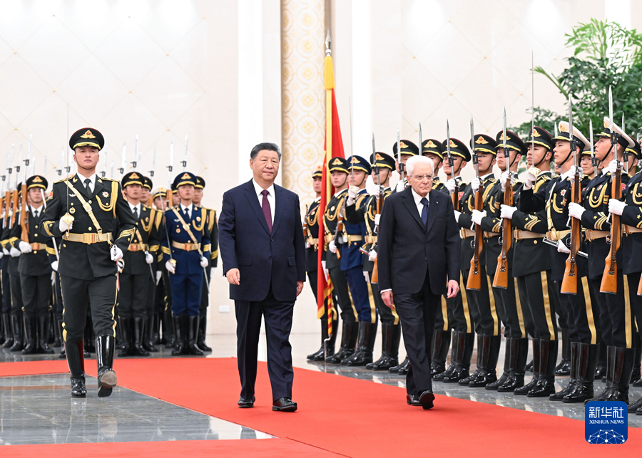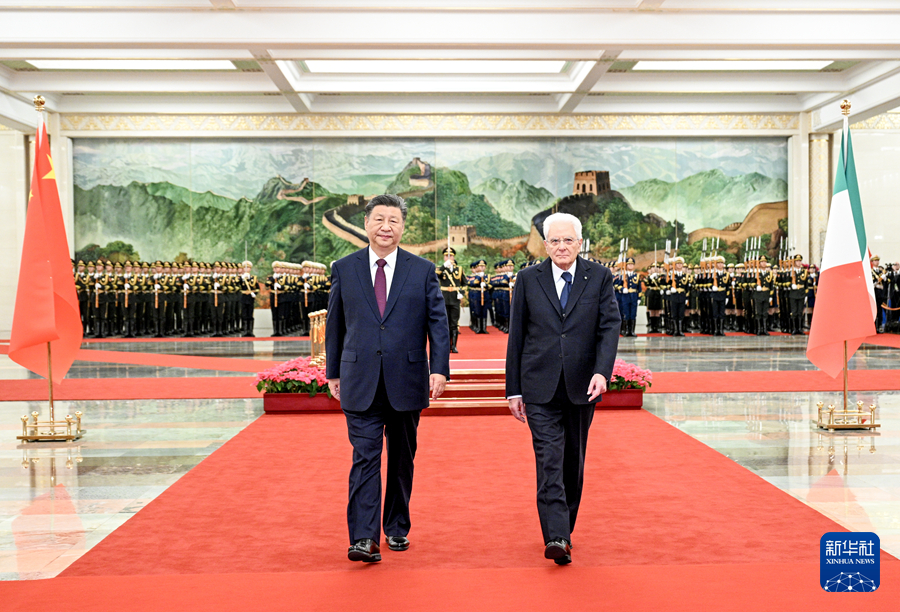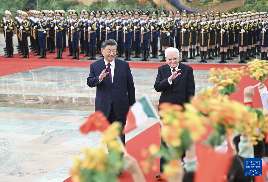 11月8日下午,国家主席习近平在北京人民大会堂同来华进行国事访问的意大利总统马塔雷拉举行会谈。这是习近平在人民大会堂北大厅为马塔雷拉举行欢迎仪式。