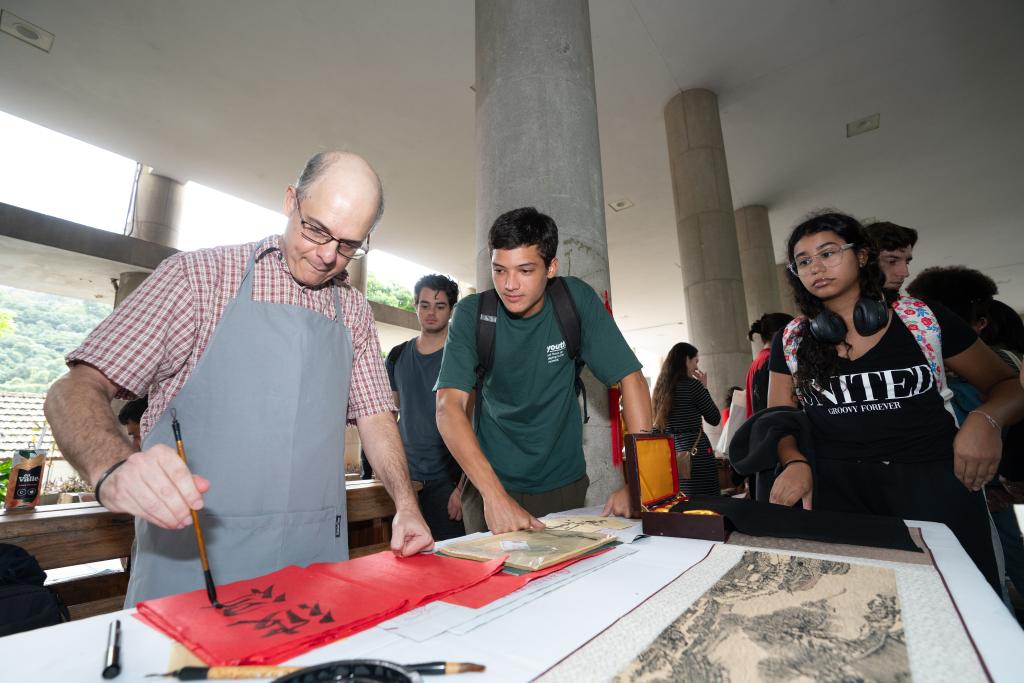 4月18日,在巴西里约热内卢举行的联合国中文日活动上,巴西学生观看中国书法展示。新华社记者 王天聪 摄