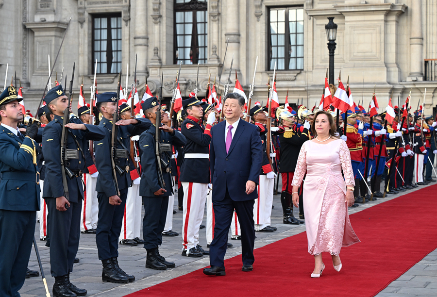 当地时间11月14日下午,国家主席习近平在利马总统府同秘鲁总统博鲁阿尔特举行会谈。博鲁阿尔特在总统府前广场为习近平举行隆重盛大欢迎仪式。习近平在博鲁阿尔特陪同下检阅仪仗队。