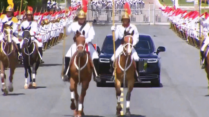 在120名龙骑兵护卫下,习近平主席乘车抵达黎明宫前广场。卢拉总统和夫人罗桑热拉热情迎接习近平主席,并为习近平主席举行隆重盛大欢迎仪式。