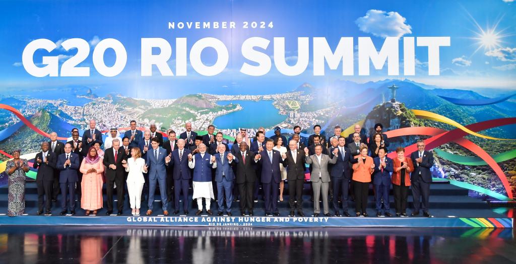 当地时间11月18日上午,国家主席习近平在巴西里约热内卢出席二十国集团领导人第十九次峰会。在峰会第一阶段围绕“抗击饥饿与贫困”议题讨论时,习近平发表题为《建设一个共同发展的公正世界》的重要讲话。新华社记者李学仁摄
