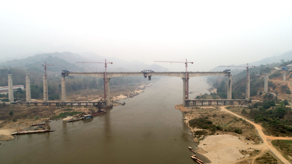 2020年4月1日,位于老挝北部的中老铁路全线墩身最高、跨度最大的桥梁——班纳汉湄公河特大桥实现大桥主桥合龙(无人机照片)。