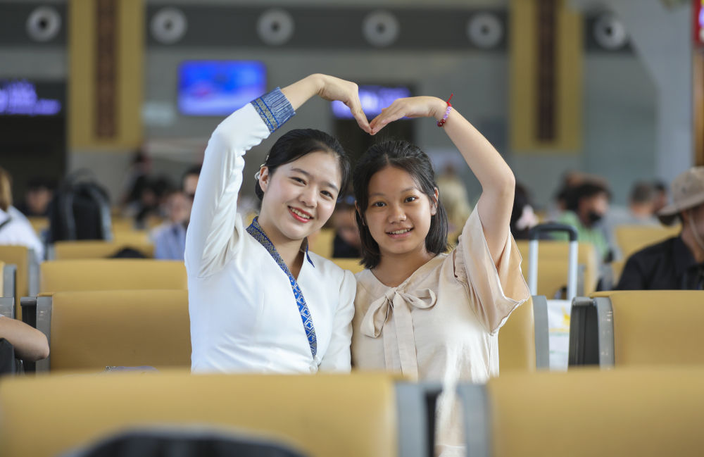 2024年4月15日,在中老铁路老挝琅勃拉邦站,车站工作人员与旅客合影。截至2024年11月4日,中老铁路老挝段今年累计发送旅客300万人次,提前完成全年客运任务目标。
