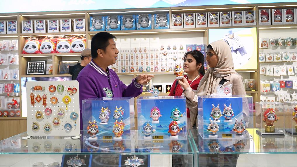 在第一站北京,她已给阿联酋的亲友准备了不少礼物:中华美景冰箱贴、中式小帽子、大熊猫钥匙扣、印有长城图案的杯子和纪念币……在北京奥运博物馆纪念品商店,她头一次接触中国潮玩,对憨态可掬的盲盒玩偶“龙墩墩”爱不释手。