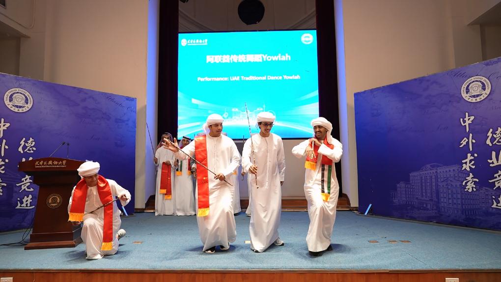 4月7日,在天津外国语大学举办的开班仪式上,阿联酋学生现场表演传统舞蹈。新华社记者 胡震泽 摄