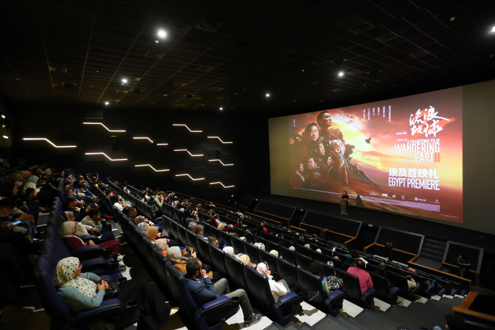 2023年3月11日,观众在埃及吉萨一家电影院参加电影《流浪地球2》的首映礼。该片由长影集团联合出品,累计总票房超过40亿元人民币。