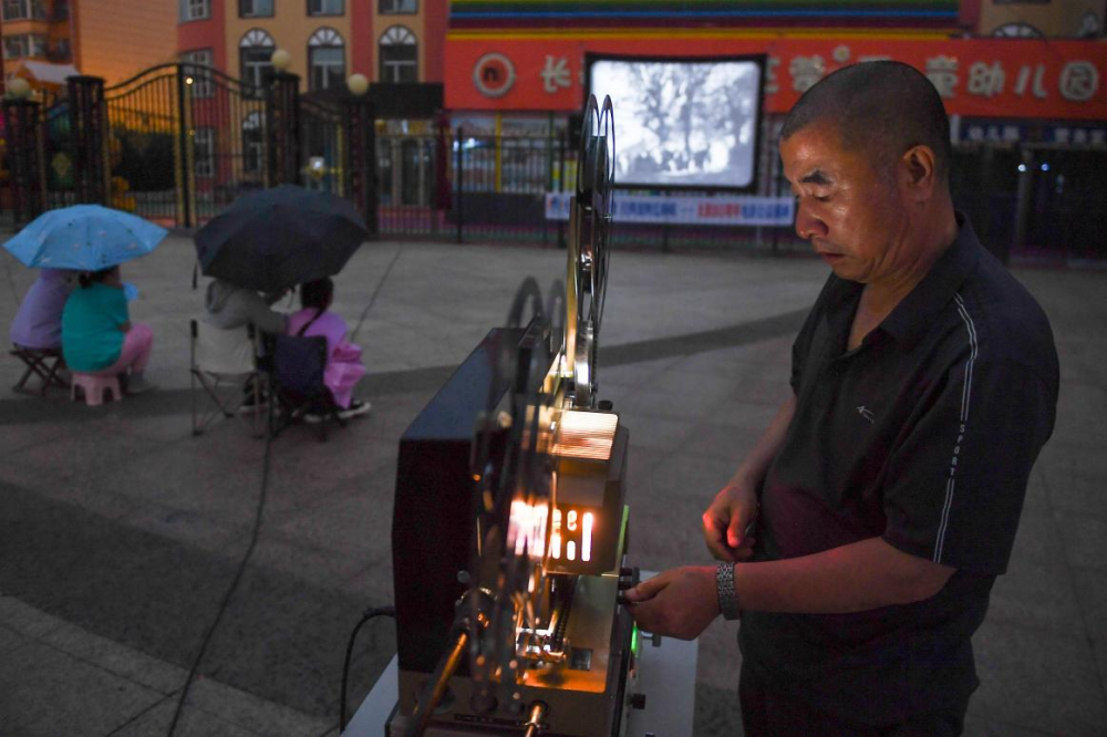 2025年8月15日,在长春市南关区鹏程社区,社区志愿者王学会为市民播放胶片电影《地道战》。