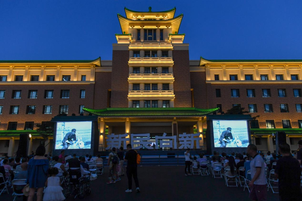 2025年8月14日,市民在长春历史博物馆前观看露天电影《侦察兵》。