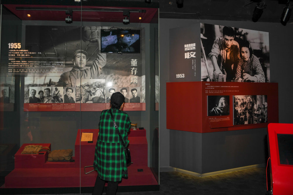 2020年10月2日,观众在长影旧址博物馆观看电影《董存瑞》介绍展板。董存瑞这一角色由张良饰演。