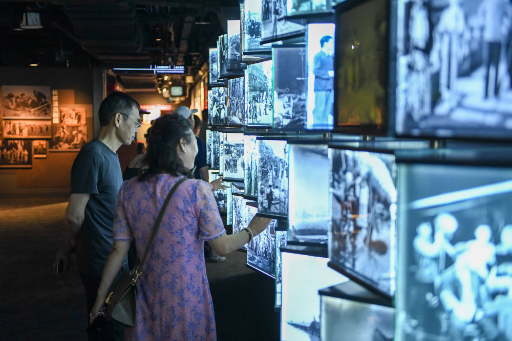 2025年8月7日,游客在长影旧址博物馆观看长春电影制片厂摄制团队早期拍摄电影时的工作照。