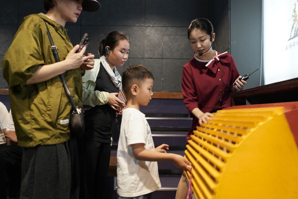 2025年8月7日,小朋友在长影旧址博物馆拟音互动室参观体验。