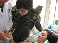 “芭蕾女孩”、“敬礼娃娃”军营谢恩人 2008年5月13日晨,三岁的郎铮被解放军官兵从废墟里救出后,躺在一块小木板做的临时担架上,用他稚嫩的右手向八位抬着他的解放军叔叔敬了个少先队礼,他的举动引起社会各界高度关注,成为灾区儿童面对灾害时不屈和感恩的象征。被媒体称为“敬礼娃娃”。 |