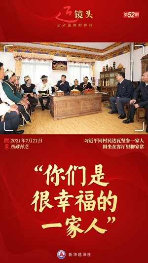 洗澡用的热水从哪里来、仓库里的粮食都怎么用、冬天睡觉冷不冷、孩子上学怎么走……总书记问得很细。总书记同一家人围坐在客厅里聊家常。看着达瓦坚参一双可爱的儿女,总书记亲切地询问孩子们的志向。