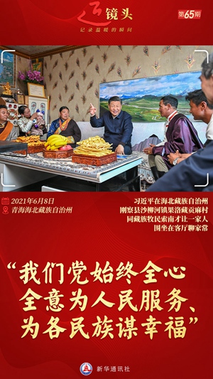 “欢迎总书记!”平均海拔3300米的果洛藏贡麻村,藏族牧民索南才让一家三代站在家门口,将洁白的哈达献给远道而来的习近平总书记。那是2021年6月8日,习近平总书记来到青海海北藏族自治州刚察县考察调研,走进藏族牧民索南才让家里。