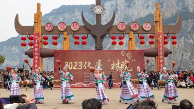 连日气温回升,为新春出游的人们带来更加美好的心情。春节长假,地处乌江源百里画廊的化屋村游人如织,行走在绿水青山之间,人们提前开启了“踏春模式”。在化屋村同心广场的舞台上,身着节日盛装的“歪梳苗”妇女们载歌载舞,对唱山歌、跳芦笙舞。欢快的节奏,优美的曲调,吸引进村旅游的游客驻足观看。