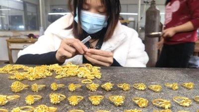 造型可爱的兔子戒指、红绳穿成的兔子手链、银光闪闪的兔子耳钉……春节前夕,在广东省汕尾市海丰县梅陇镇,许得应的首饰工厂进行着节前最后一批新年饰品的生产,工人们围坐在工作台前忙着打包装货。“这批以生肖兔为主题的新年首饰供不应求,订货量一批接着一批。”海丰县梅陇卡莱妮首饰厂老板许得应说。
