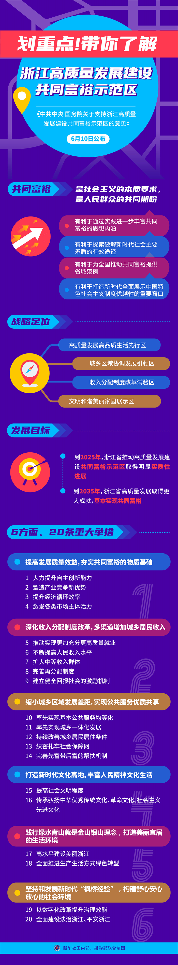 《中共中央 国务院关于支持浙江高质量发展建设共同富裕示范区的意见》10日发布。共同富裕示范区有哪些亮点?提出了哪些重大任务?如何让共同富裕看得见、摸得着、真实可感?打开这张图,带你了解浙江高质量发展建设共同富裕示范区。(记者谢希瑶、安蓓,制图陈为)