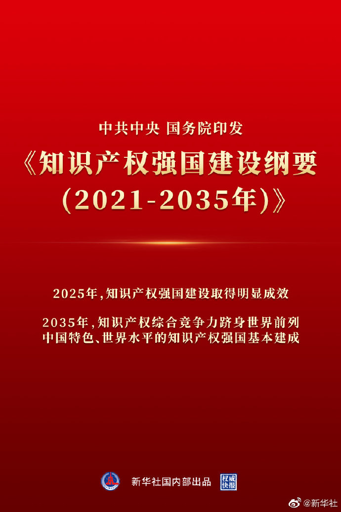 近日,中共中央、国务院印发了《知识产权强国建设纲要(2021-2035年)》。纲要提出,到2025年,知识产权强国建设取得明显成效;到2035年,知识产权综合竞争力跻身世界前列,中国特色、世界水平的知识产权强国基本建成。纲要部署了“建设面向社会主义现代化的知识产权制度”“建设支撑国际一流营商环境的知识产权保护体系”“建设激励创新发展的知识产权市场运行机制”“建设便民利民的知识产权公共服务体系”“建设促进知识产权高质量发展的人文社会环境”“深度参与全球知识产权治理”六个方面重点任务。(记者张泉、温竞华,海报设计杨轶群)
