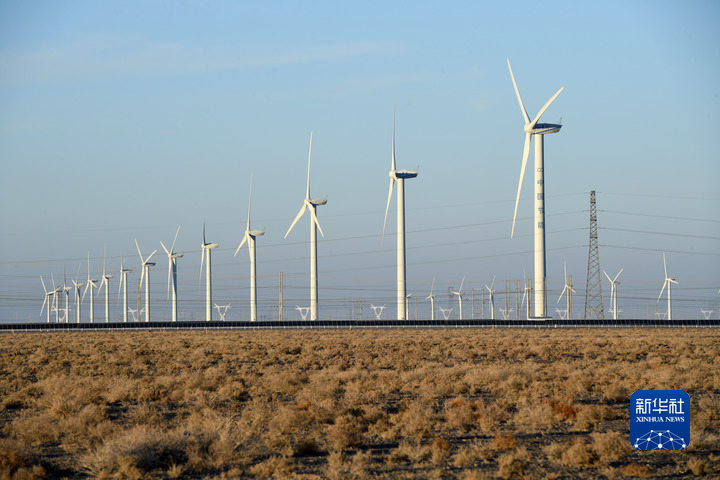 这是2021年12月8日拍摄的中节能(甘肃)风力发电有限公司玉门昌马风电场的风机。 新华社记者 范培珅 摄