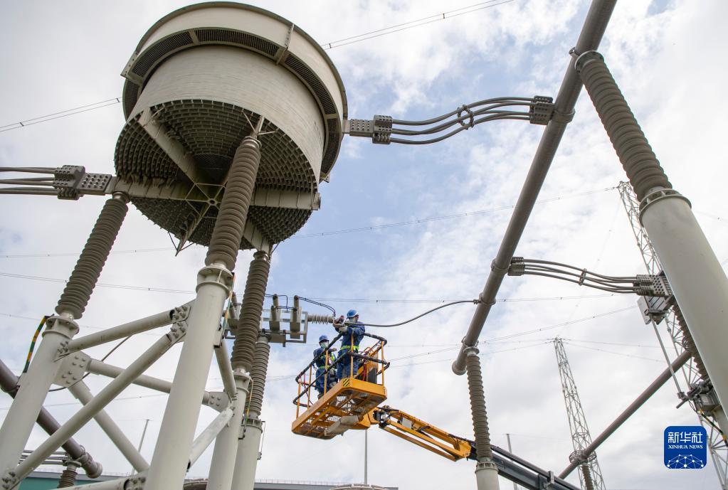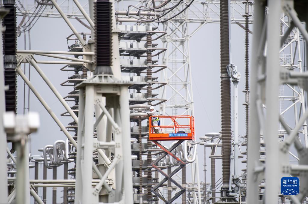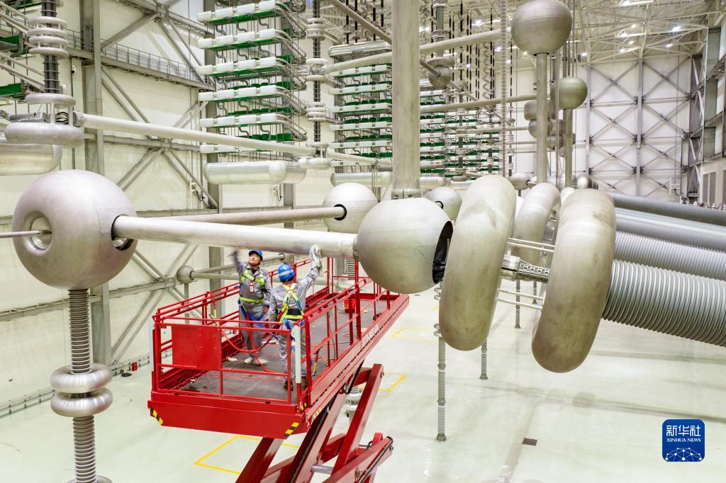10月9日,国网安徽电力检修人员对古泉换流站设备进行检修、维护。 新华社发(郑贤列摄)