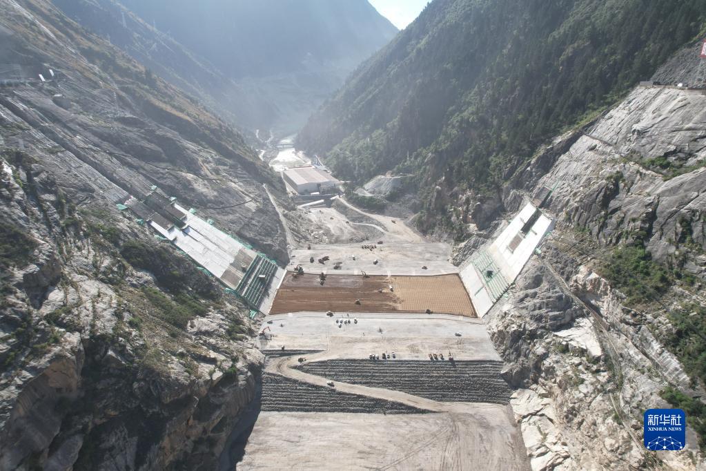 世界级高坝——双江口水电站大坝填筑至百米高度。 新华社记者 杨进 摄
