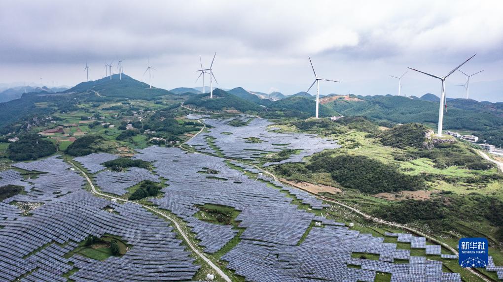 位于安龙县新桥镇的贵州金元木科农业光伏电站(7月5日摄,无人机照片)。 近年来,贵州抓住新能源发展的时代机遇,风电、光伏发电等新能源产业迅猛发展。在大力发展绿色能源的同时,贵州还充分利用光伏板下的土地种植农作物,带动有条件的农户发展畜牧养殖。截至2023年6月底,贵州省新能源装机总容量累计达2181万千瓦,这些“风吹日晒”产生的经济效益,正逐渐成为贵州山区发展的新动能。 新华社记者 陶亮 摄